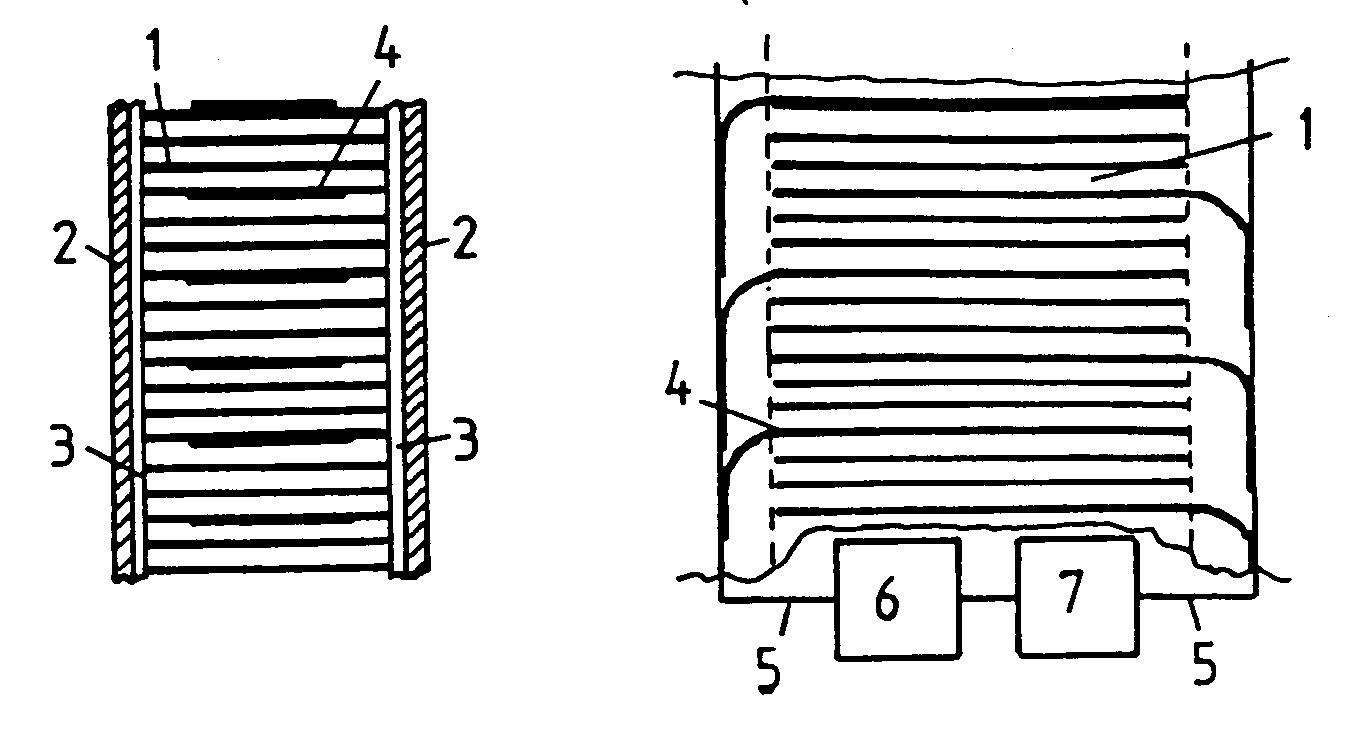 Abstract: The thermoelectric device disclosed in U.K. Patent 2,227,881 is developed by this invention to accentuate the Nernst Effect contribution. By using thin ferromagnetic metal laminations 1 of thickness commensurate with or smaller than the normal magnetic domain size (100 micron) and feeding current transversely through the laminations with heat flow in the laminar planes, the current, regardless of polarity, selects a passage through the lamination which traverses a magnetic domain polarization having a direction in which the Nernst EMF assists the current. This results in a conversion of heat into electricity. A superconducting polymer, oxidized polypropylene, may be used as a heat resistant filler between the laminations to provide the continuity for transverse current flow. Heat sinks 2 are insulated by coatings 3 and connections are made by conductors 4.