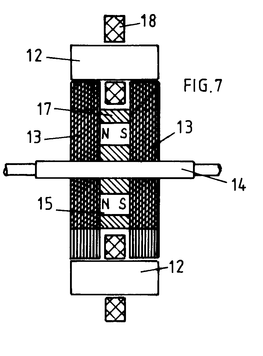 Abstract: An electrodynamic motor-generator has a salient pole permanent magnet rotor interacting with salient stator poles to form a machine operating on the magnetic reluctance principle. The intrinsic ferromagnetic power of the magnets provides the drive torque by bringing the poles into register whilst current pulses demagnetize the stator poles as the poles separate. Inasmuch as less power is needed for stator demagnetization than is fed into the reluctance drive by the thermodynamic system powering the ferromagnetic state, the machine operates regeneratively by virtue of stator winding interconnection with unequal number of rotor and stator poles. A rotor construction is disclosed in (Fig. 6, 7). The current pulse may be such as to cause repulsion of the rotor poles.