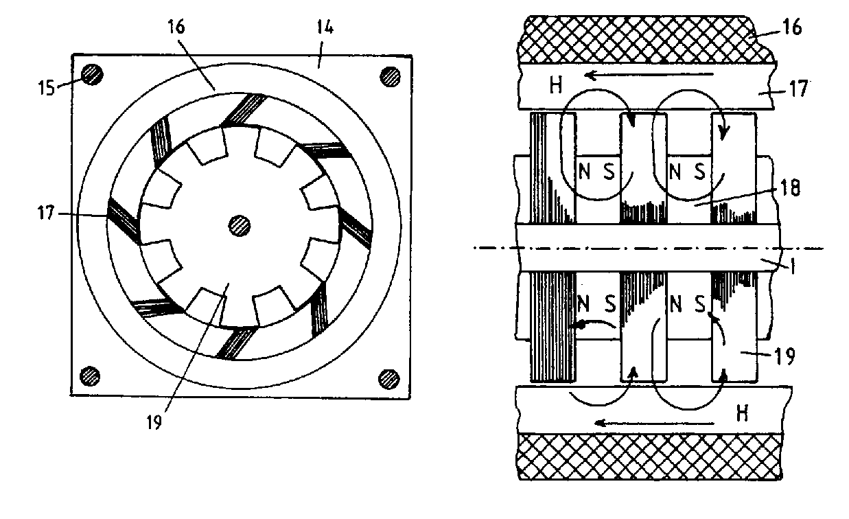 Abstract: A magnetic reluctance motor has a rotor which comprises several laminated rotor sections 19 axially spaced along a supporting spindle 1. Between these rotor sections there are permanent magnets 18 or ferromagnetic ring cores with rotor excitation windings serving as electromagnets. The rotor sections have salient poles interacting with a set of elongated stator cores 17 mounted parallel with the axis of the spindle and around which there is a magnetizing winding 16 which powers the motor by current pulses which promote magnetic flux switching (field H) affecting the magnetic attraction between the stator and rotor poles. The motor has an efficiency dependent upon the recovery of inductive energy fed to the magnetizing windings and a dual motor combination is described in which such recovery involves energy exchange between the two motors. A primary feature is the use of a solenoidal magnetizing winding 16 which determines the polarization of all the cores in the same motor.